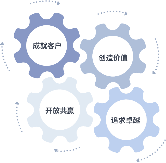 成就客户是一切决策的出发点,,,,创造价值是衡量所有工作的标准,,,追求卓越是我们做事做人的态度,,开放共赢是我们的格局也是最终的结果。。。。价值观的齿轮环环相扣,,推动着组织里的每个人不断向前。。。。