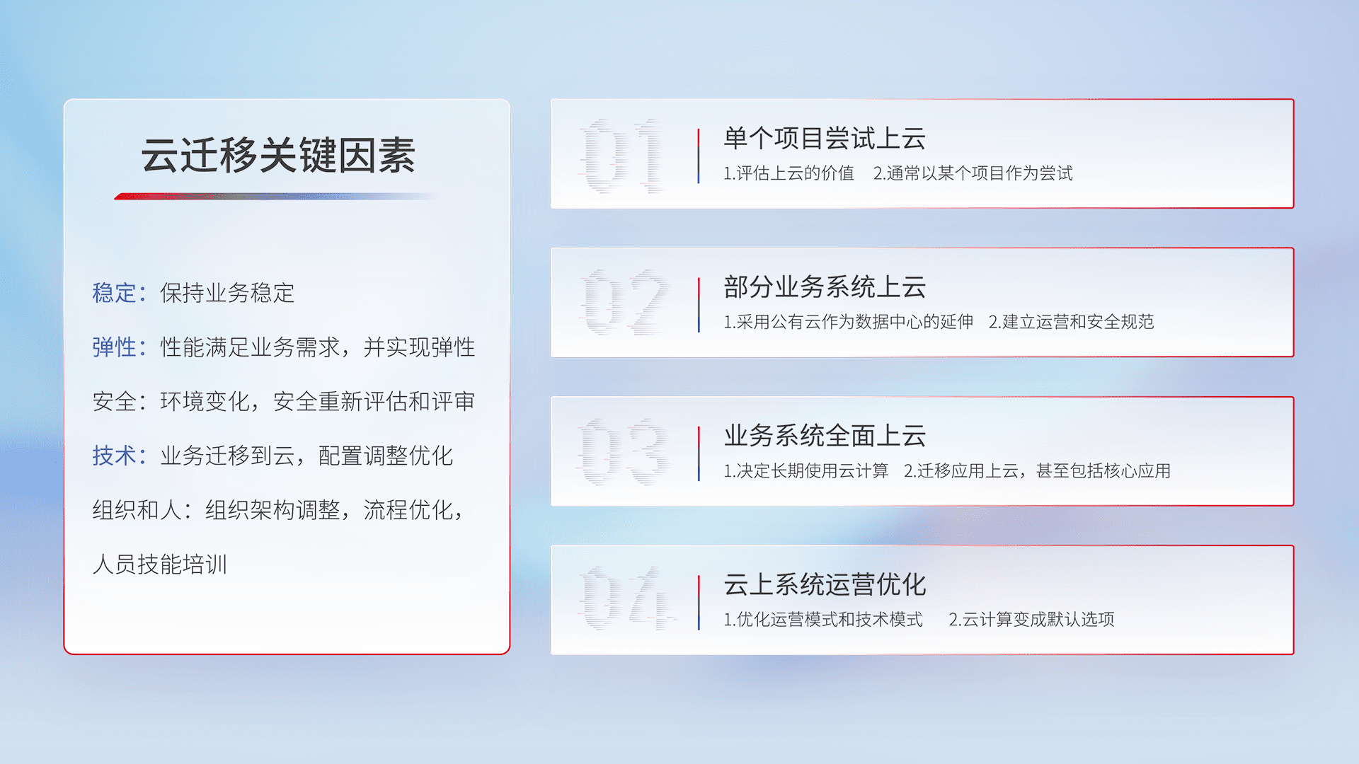结合实际业务,,从规划设计、、、云平台选型、、、云原生改造、、数据迁移、、集成交付,,,,迁移全过程为客户识别最佳上云路径,,,做好风险识别管理,,设计网络架构、、、身份权限、、安全审计合规、、、、操作审计、、、、日志审计、、、监控告警策略、、、、多站点容灾设计等,,对云上基础设施进行整体规划,,,提升IT治理水平,,,以满足弹性、、、、高可用、、、高性能的需求。。。