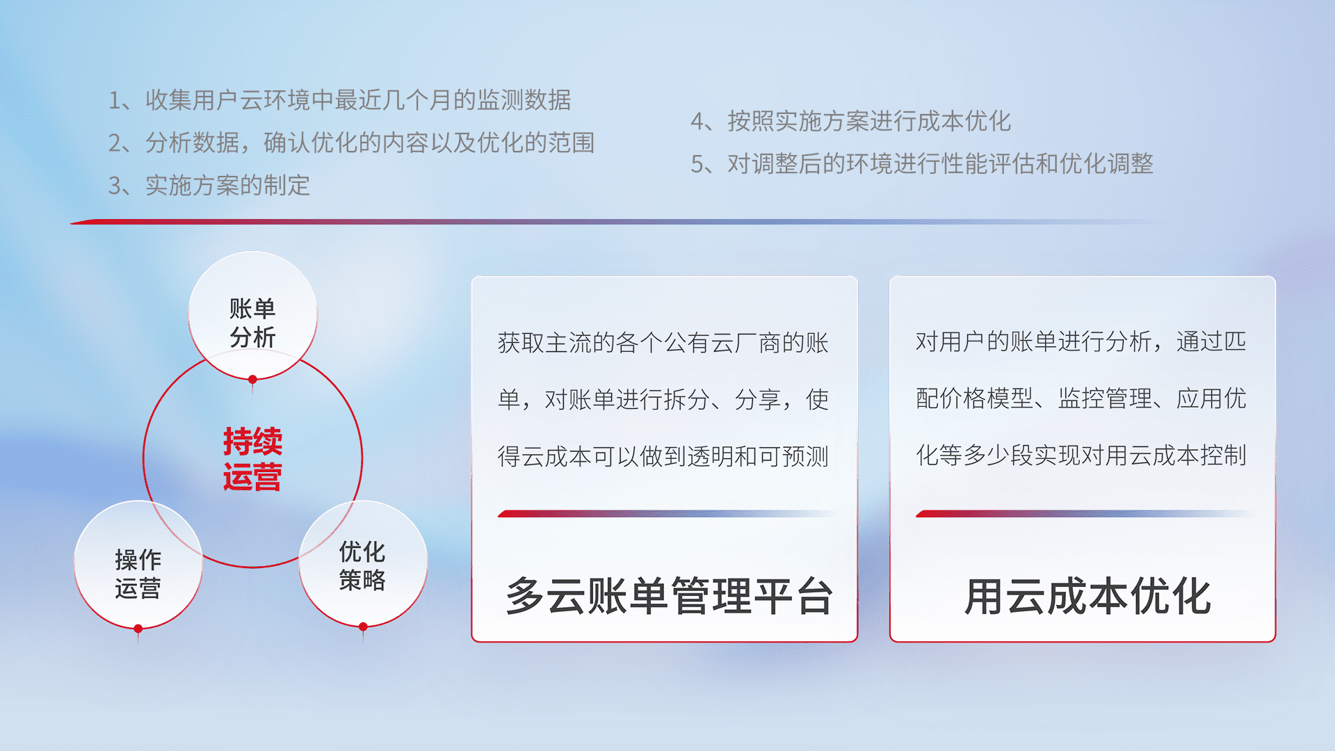 通过多云纳管,,,,以统一的资源数据模型把客户的云资源进行抽象和封装,,,,进而实现对多云资源的统一操作,,,保障云资源管理的可靠性、、稳定性与可用性。。量身定制化运维内容,,,配置、、、开发运维、、、、补丁管理、、备份、、监控、、、认证和访问管理、、、审计和日常巡检等,,,保障在用云过程中的可靠度,,,稳定度以及高可用率。。。